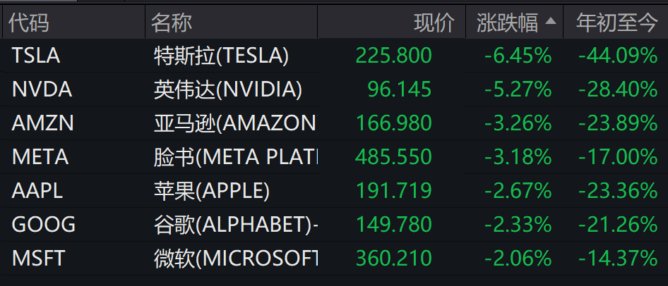 美国科技七巨头全线下跌。特斯拉跌近7%,英伟达跌超5%。