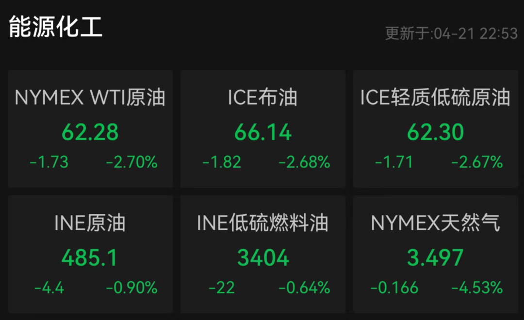 WTI原油期货一度跌超3%,现报62.28美元/桶;布伦特原油一度失守65美元/桶。